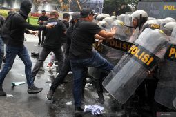 Pengunjuk rasa terlibat bentrok dengan aparat kepolisian saat Simulasi Sistem Pengamanan Kota (Sispamkota) di depan Balai Kota Malang, Jawa Timur, Selasa (30/9/2025). Simulasi tersebut melibatkan 1.700 personel gabungan dari TNI, …