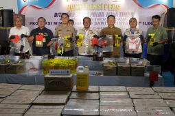 Dirreskrimsus Polda Jatim Kombes Pol Roy H.M. Sihombing (tengah), Kabid Humas Polda Jatim Kombes Pol Jules Abraham Abast (ketiga kiri), Kasubdit Indagsi pada Direktorat Reserse Kriminal Khusus (Ditreskrimsus), AKBP Farris Nur …