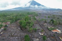 Foto udara kondisi perkampungan terdampak timbunan material vulkanis di Desa Supiturang, Pronojiwo, Lumajang, Jawa Timur, Kamis (20/11/2025). Pemerintah provinsi Jawa Timur berkoordinasi dengan instansi terkait tengah menurunkan …